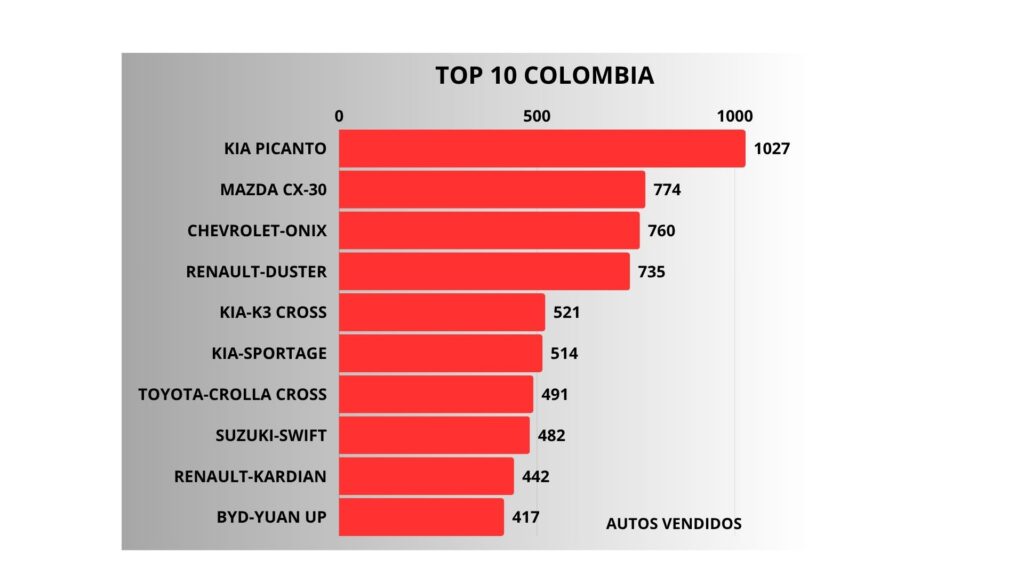 A pesar del liderazgo del Picanto, el mercado sigue siendo un campo de batalla para el segmento SUV y Crossover. Los modelos de este tipo ocupan cuatro de los cinco primeros puestos, con el Mazda CX-30, Chevrolet Onix y Renault Duster disputándose intensamente la segunda posición, todos rondando las 750 unidades vendidas.