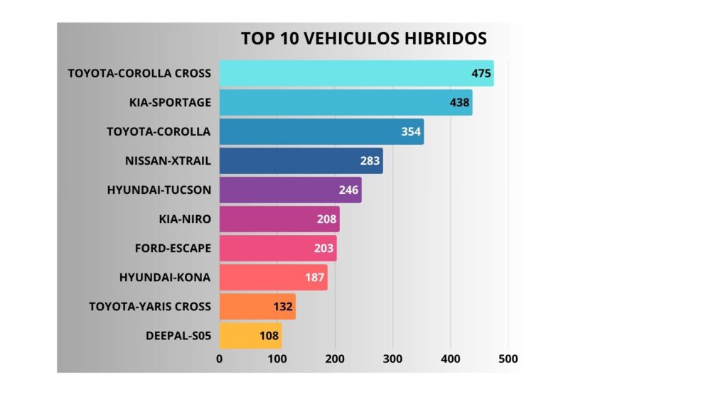 - SUV con Tracción: El Nissan X-Trail (283 unidades) y la Hyundai Tucson (246 unidades) demuestran que los consumidores también buscan vehículos utilitarios más grandes con capacidades híbridas.