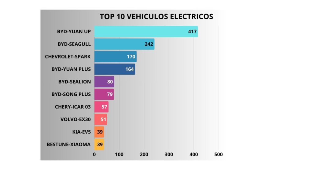 - Fuerza Subcompacta: El BYD Seagull (242 unidades) y el BYD Yuan Plus (164 unidades) aseguran las primeras posiciones, demostrando que la marca tiene la oferta más robusta en los segmentos SUV y subcompactos.